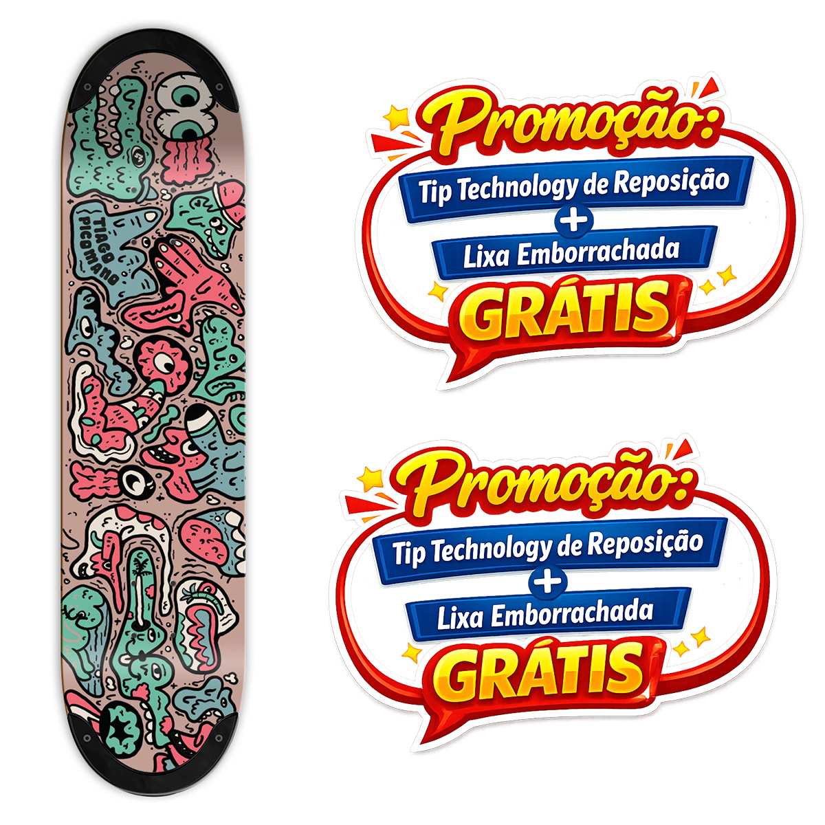 O shape exclusivo de Tiago Picomano – Doodle traz arte, criatividade e performance no mesmo shape. Produzido em maple canadense e equipado com a inovadora TIPtech, ele garante durabilidade até 3x maior e pop consistente, para transformar cada sessão em rolê de alto nível.