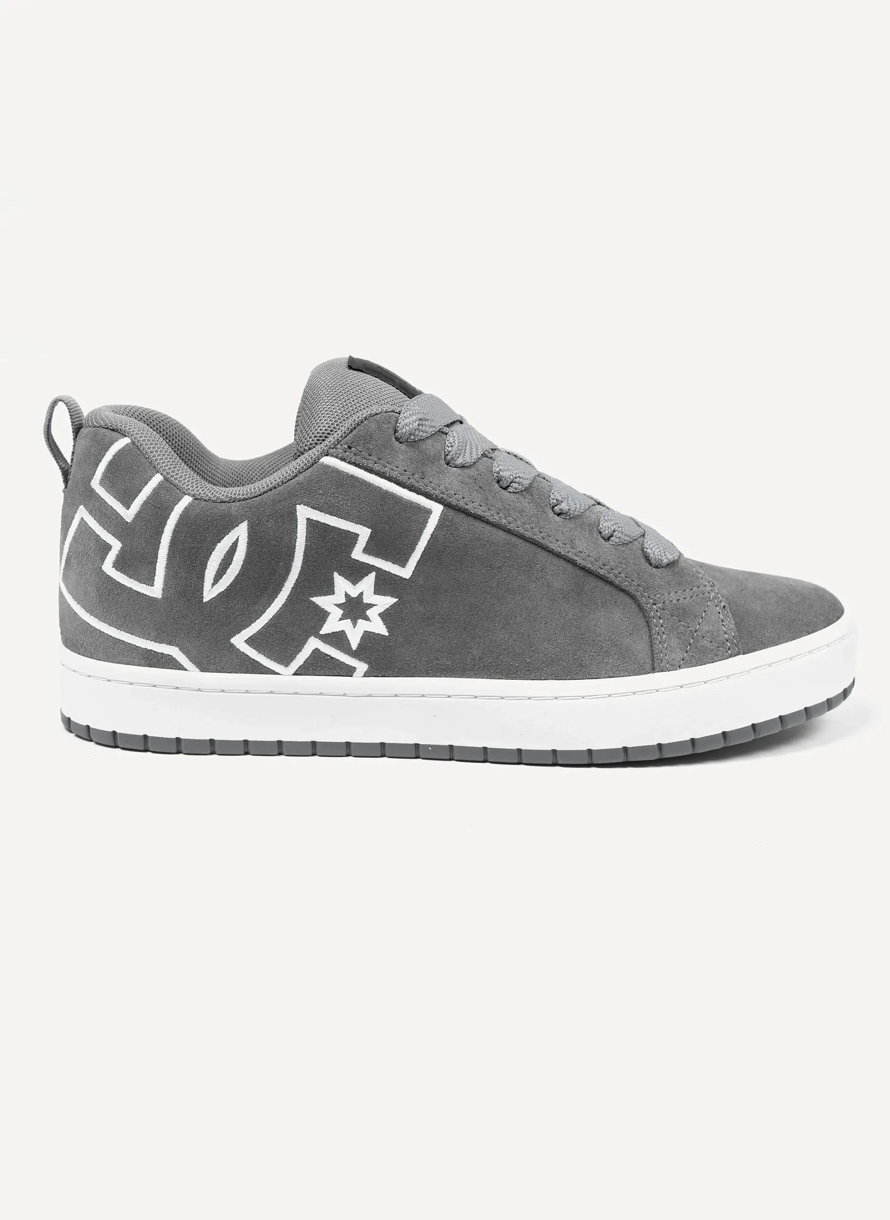 O logo lateral aplicado e o acabamento em cinza com solado branco entregam personalidade sem abrir mão do estilo urbano característico da DC.