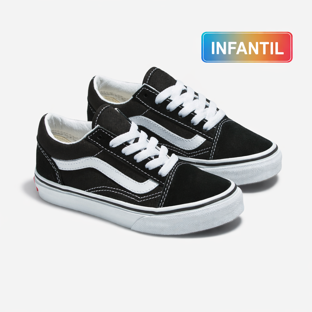Construído com cabedal de camurça e lona durável em uma variedade de cores clássicas, o Tênis Old Skool Infantil Black True White homenageia essa tradição,